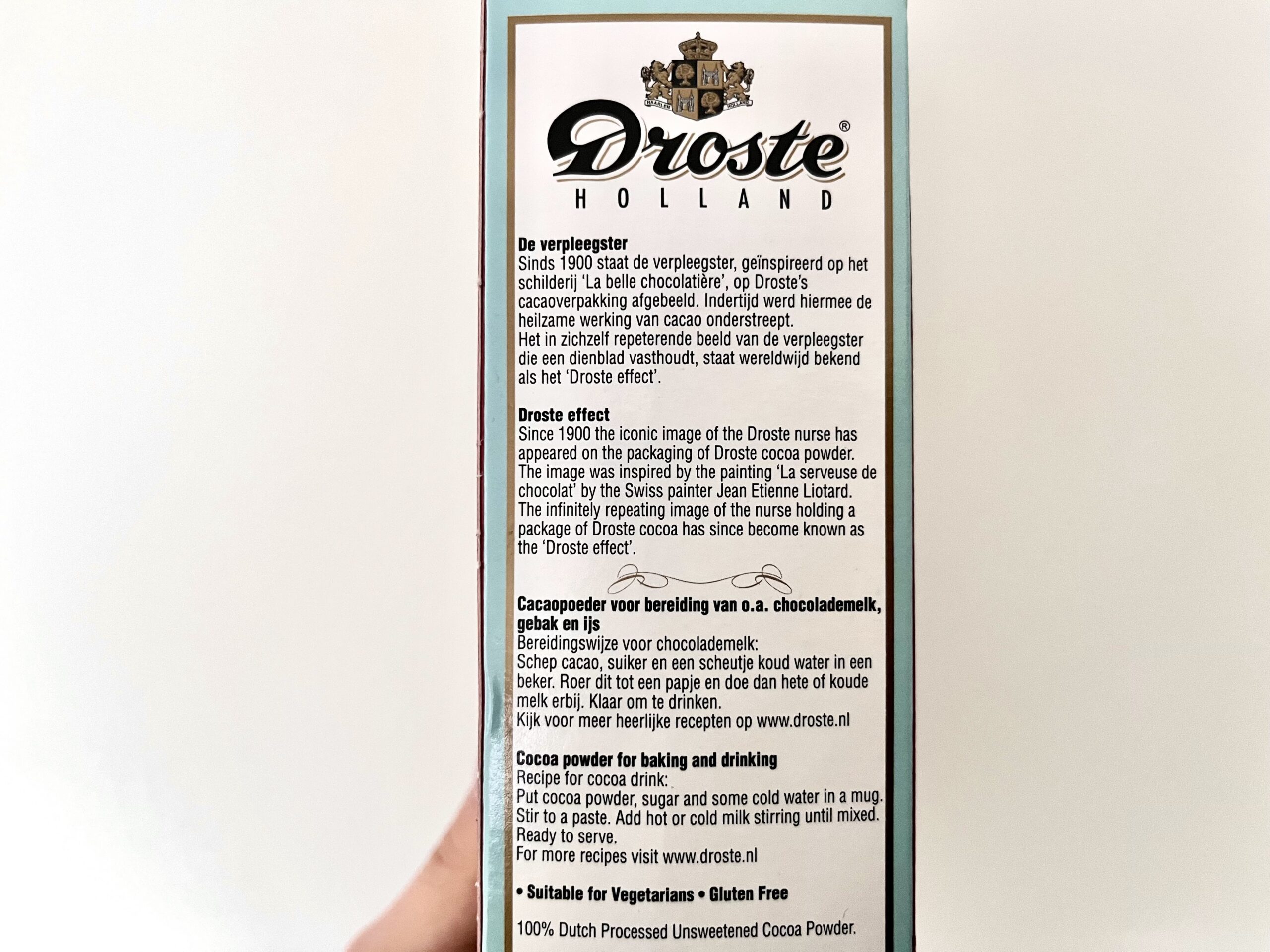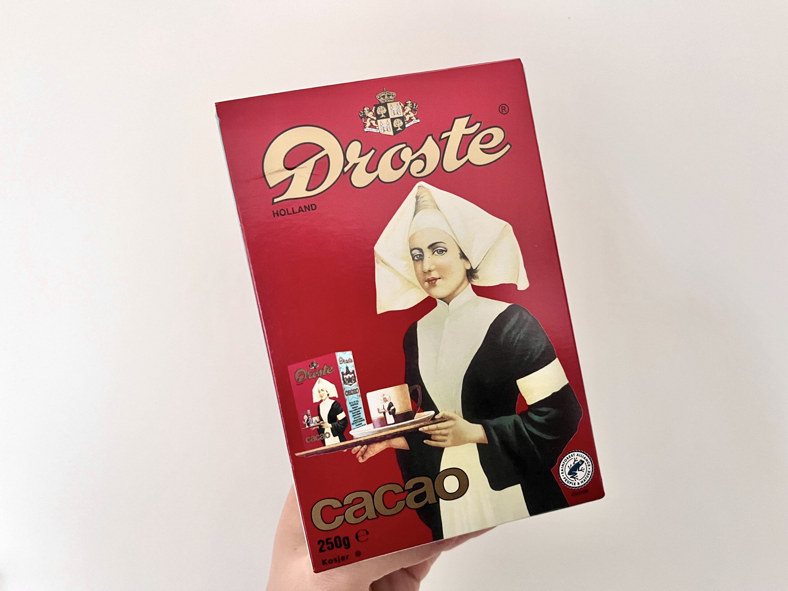その箱の絵には、コップとドロステ・ココアの箱が乗ったお盆を持つ女性が描かれています。